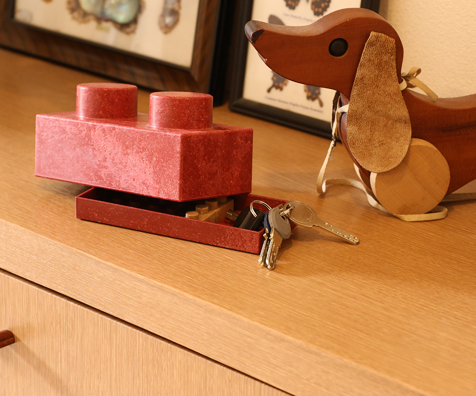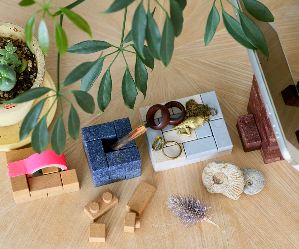 By combining REN Blocks, you can create your own interior designs. From a flexibly configurable plant cover and a mini-flowerbed for your veranda to a record shelf and a luxurious house for your dog, the possibilities for creation are infinite. Even you own dream house may be possible! REN Block’s unique texture, which is neither of wood nor of plastic, offers extraordinary experiences and introduces you to creative lifestyles. Because it uses natural materials, the texture is slightly different piece by piece. Each block is in a handy size that fits within the palm of your hand and is made of a safe material even for children to use. Three color variations are available, including black, brown, and beige.REN Block is a unique brick-type block made with organic materials. By mixing 55–60% Japanese cedar cellulose with 40–45% binder resin, an originally wooden material is thermoplasticized, pelletized, and then injection molded in a brick from. To produce this block, any natural fibrous materials can be used, including tree barks, plain wood, or coffee and cacao beans. Because it can utilize organic waste materials such as forest thinnings, it can contribute to environmental protection, including CO2 emissions reduction and global warming prevention. In addition, since it is biodegradable, it contributes to waste reduction, too. It is a decorative block made by the state-of-the-art recycling technology