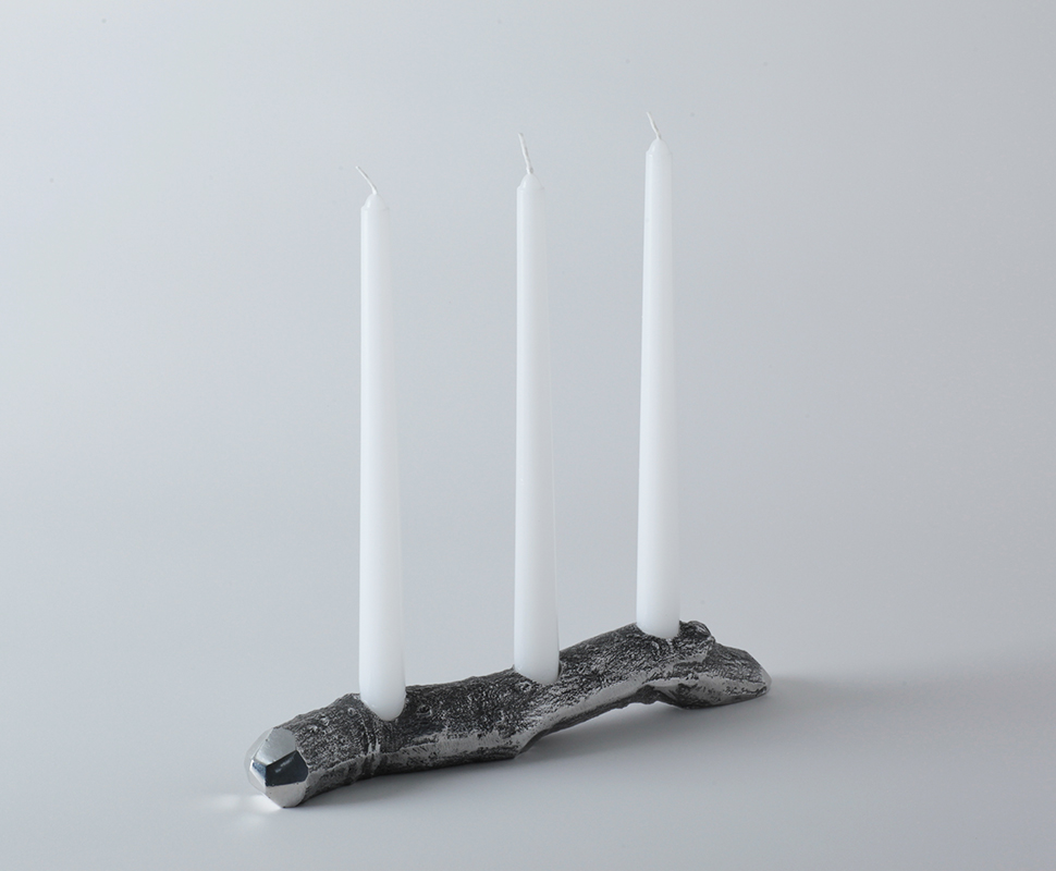 material/recicle Alminium|Size/50*290*55mmPhoto:Tomoharu NISHIMURA土から芽が出て成長し、そののち枯れて土に還る植物と高温で溶かし形状・用途を変えられる鋳造の双方の循環をリンクしたキャンドルスタンド。アルミ缶を再利用したリサイクルアルミニウムを使用し、自然に落ちている枝を原型に使用することで自然界の輪廻転生になぞらえた。 原型の木肌に砂型の砂肌が合わさることで生まれる計画性と偶然性の合間に生まれる絶妙にデフォルメされた表情は同じ形状でありながらもひとつ一つの個性となります。使い続けることで起こる金属特有の経年変化も一つの景色として楽しむことが出来ます。