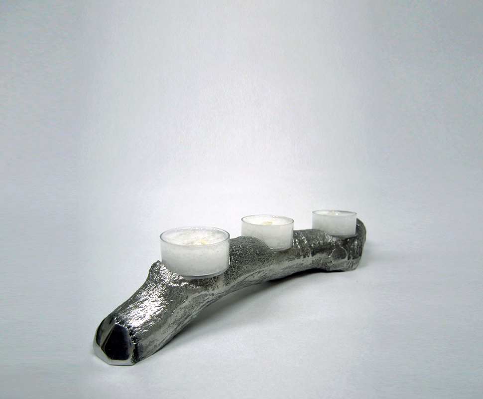 This candle stand links the cycles of plants, which sprout from the soil, grow, then wither and return to the soil, and of casting, which melts at high temperatures and changes its shape and use. It uses recycled aluminum from reused aluminum cans, and uses fallen branches as the prototype, likening it to the cycle of reincarnation in nature. The exquisitely deformed appearance born out of a mix of planning and chance, as the wooden surface of the prototype is combined with the sand surface of the sand mold, gives each piece its own unique character, even though they all have the same shape. The changes that occur over time, which are unique to metal, with continued use can also be enjoyed as part of the scenery.